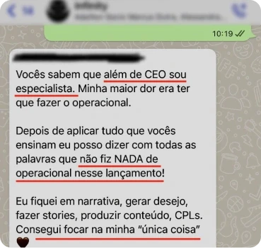 Sem falar que já mentorou +100 donos de agências de lançamento no último ano. Sem dúvidas, a melhor pessoa para ser o seu mentor no que ninguém ensina no digital: FAZER O QUE AMA, GANHAR DINHEIRO e DELEGAR TODO O RESTO, sem aprender gestão.